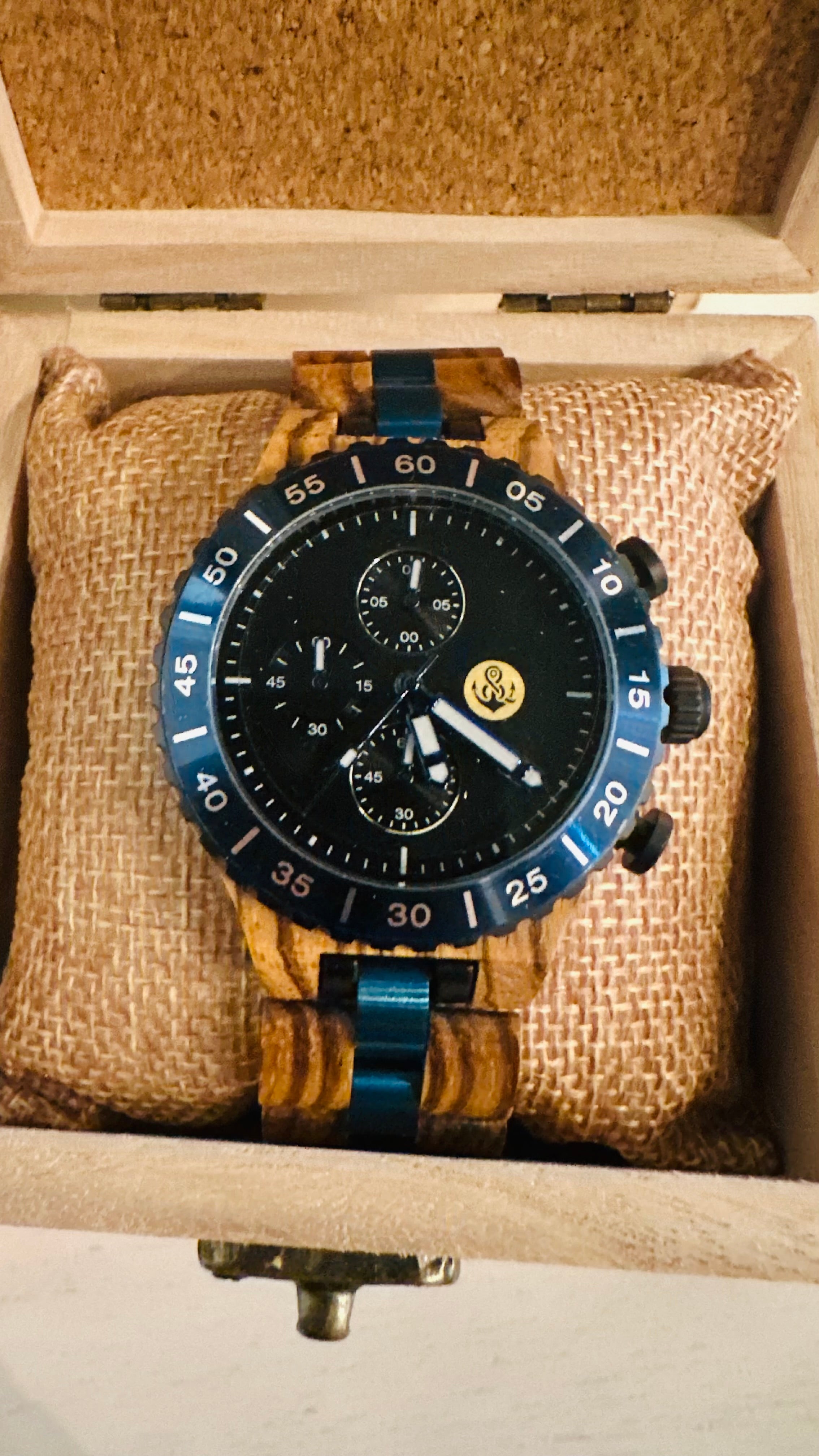 Zebra Wood & Steel Chronograph Watch - Midnight Blue & Walnut