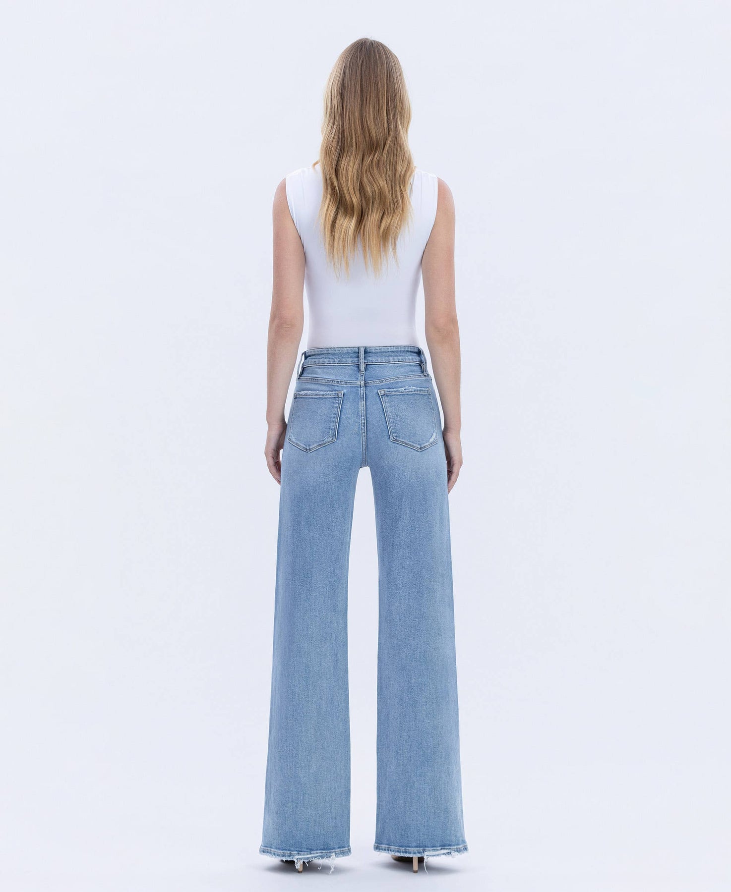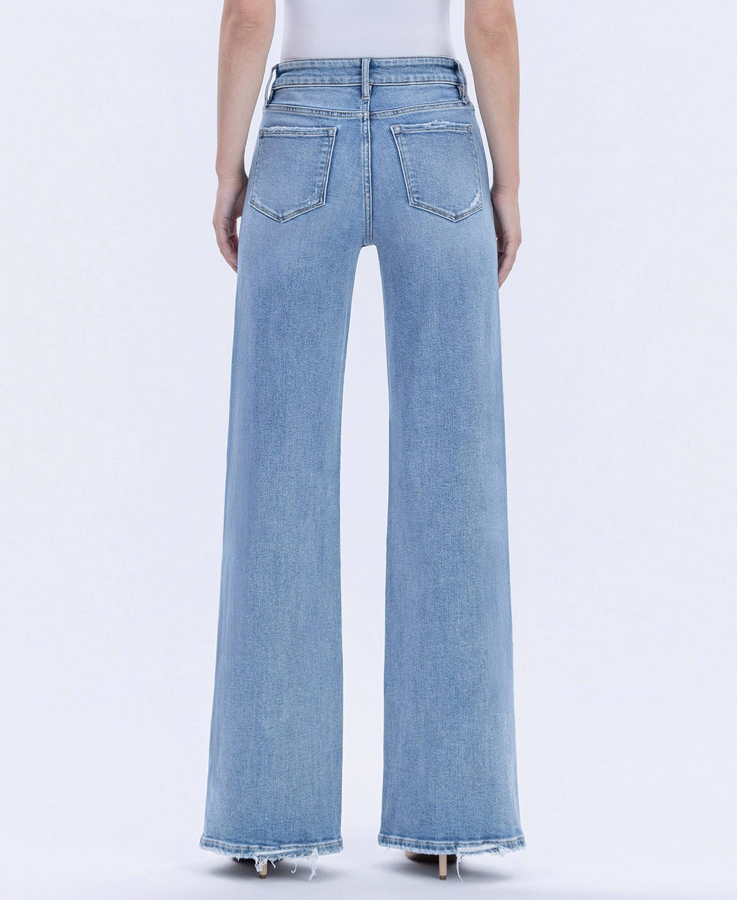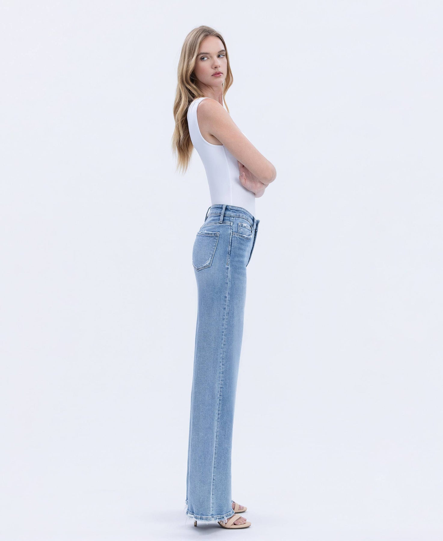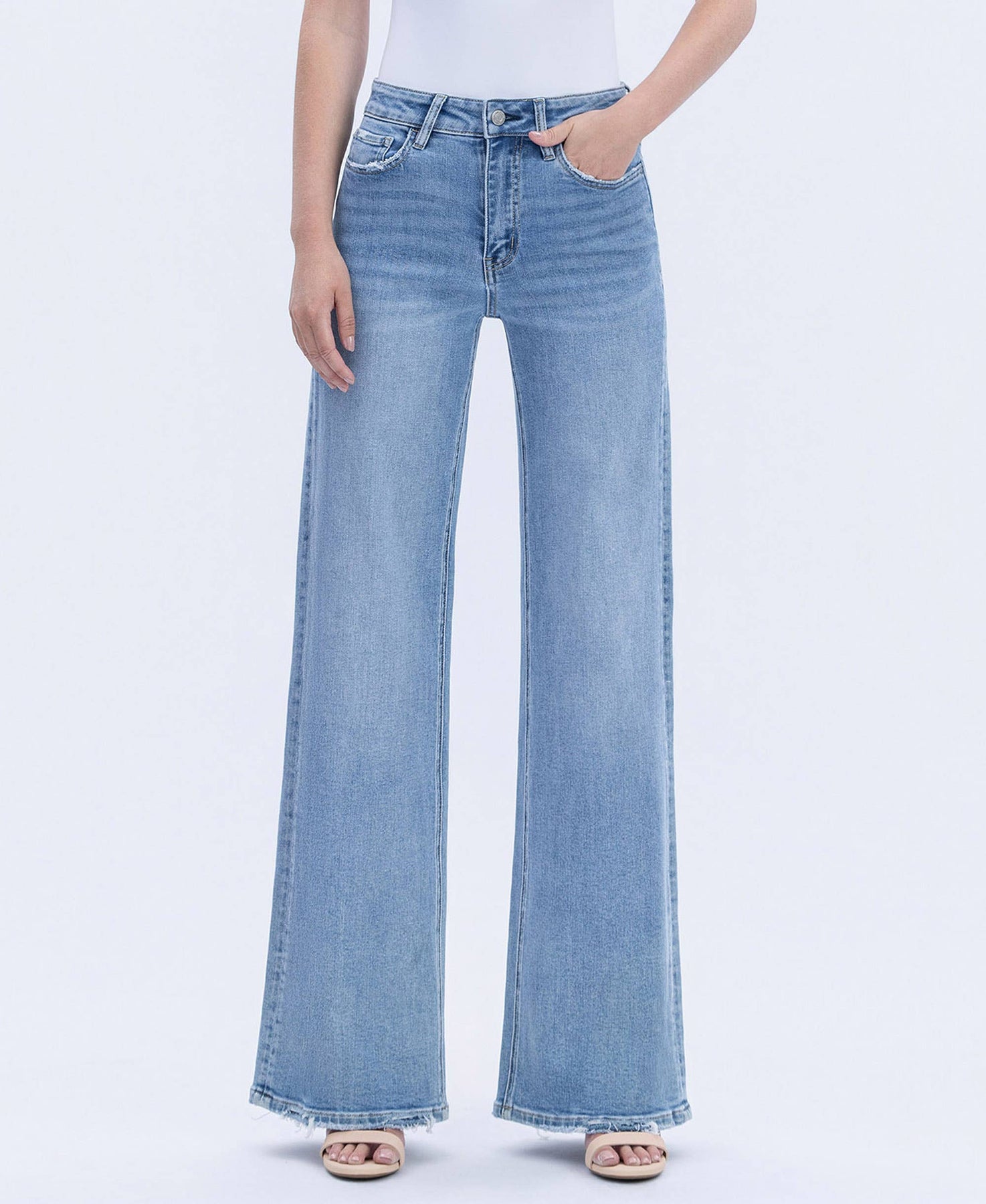 These high-rise, full-length wide-leg jeans from Flying Monkey offer a sophisticated silhouette crafted from comfortable stretch denim. Featuring a subtle distressed finish, they have a 10.5" rise, 34" inseam, and a 22" leg opening. Modeled at 5'10" wearing size 26, these jeans blend timeless style with modern ease.